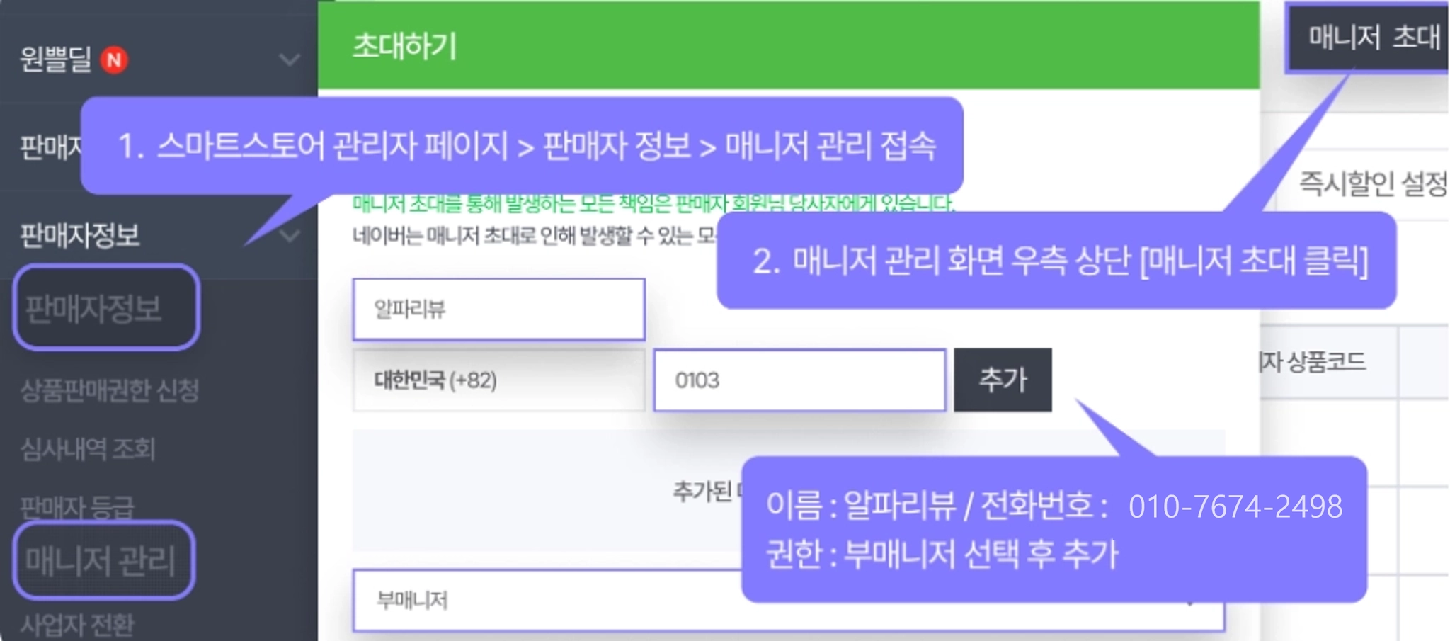 [스마트 스토어 관리자 페이지 > 판매자 정보 > 매니저 관리]