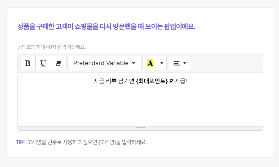 입력 창에 {최대 포인트},{고객명} 변수를 이용할 수 있습니다.