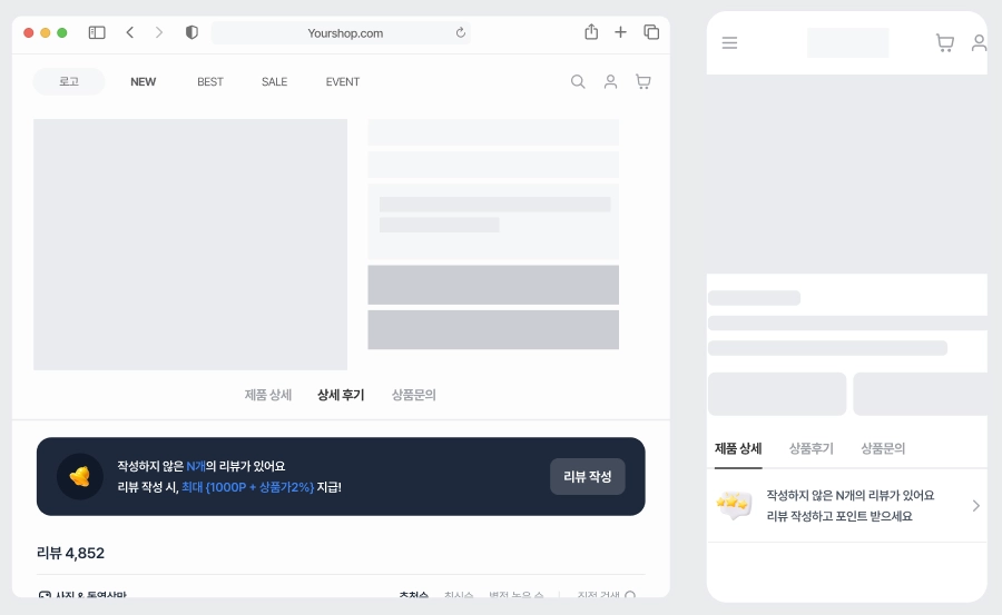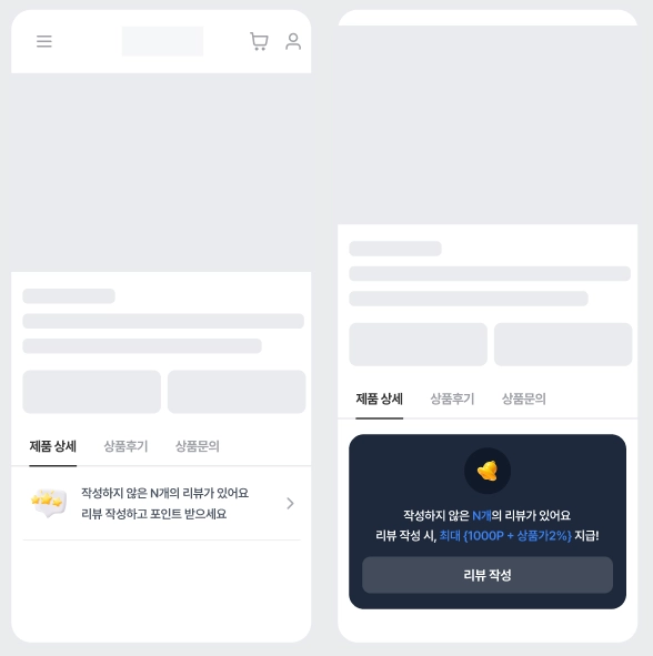 상품을 구매한 고객이 리뷰를 작성하지 않은 상태로 쇼핑몰에 방문했을 때 상품의 상세페이지 내에서 표시됩니다