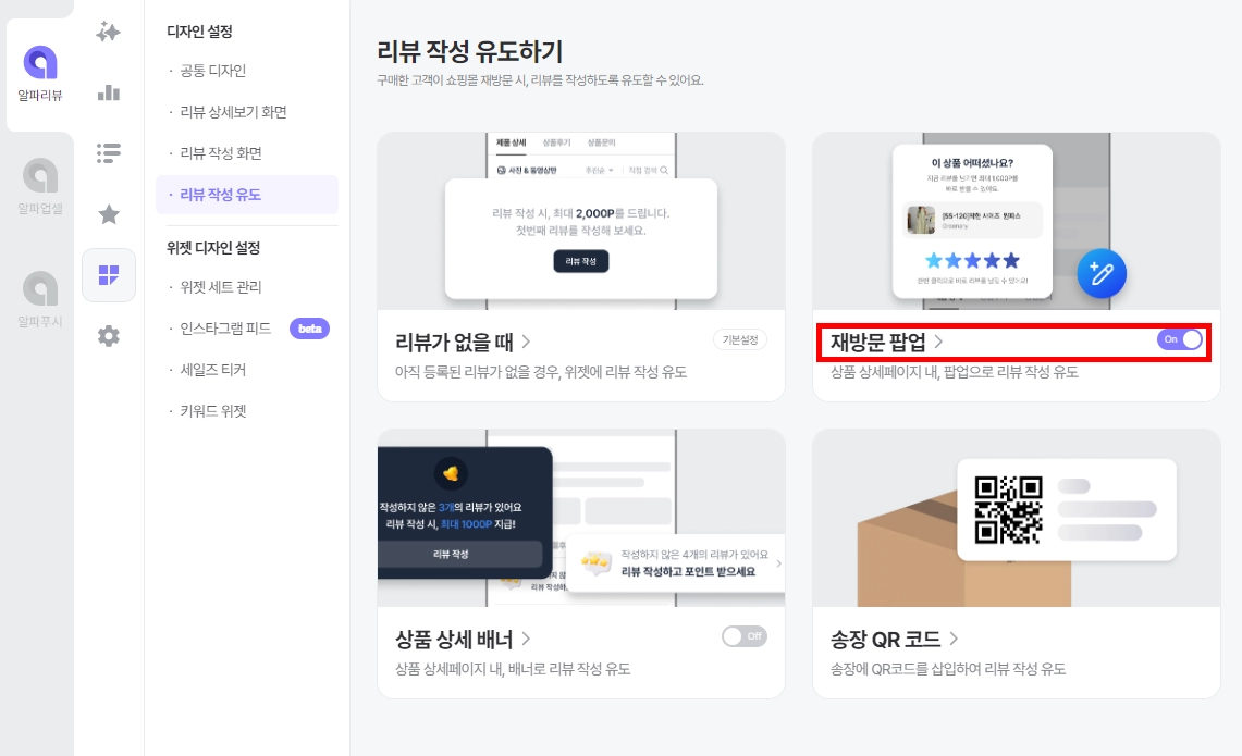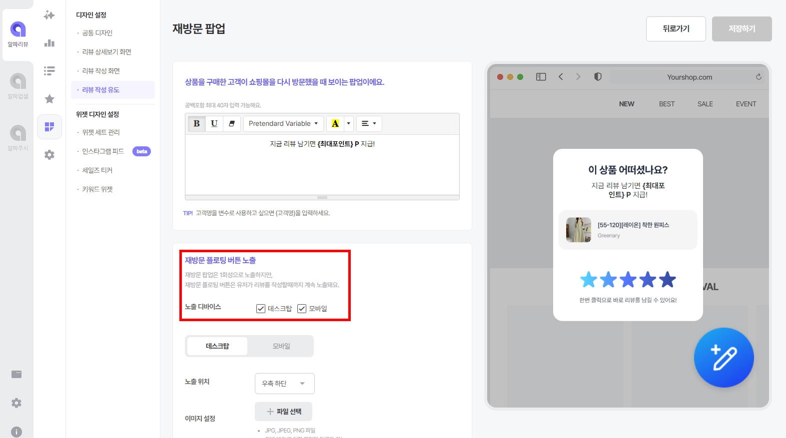[접속 경로: 디자인 설정 > 리뷰 작성 유도 > 재방문 팝업]