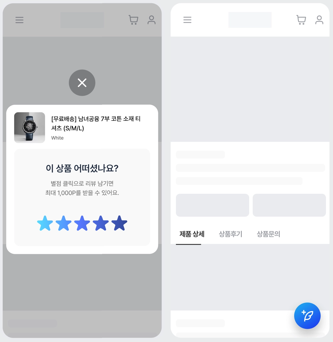 쇼핑몰 접속 시 이미지와 같이 리뷰를 작성하도록 유도하는 재방문 배너(팝업)와 플로팅 버튼이 노출됩니다