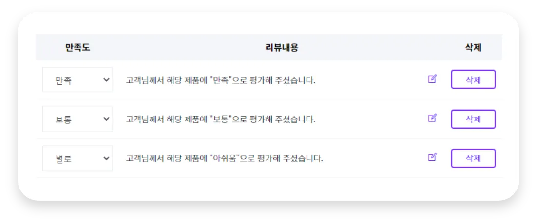 위와 같이, 빠른리뷰 문구를 고객님께서 해당 제품에 "만족"으로 평가해 주셨습니다 와 같이 빠른리뷰 문구를 설정한다면, 리뷰를 둘러보는 고객 입장에서도 리뷰에 대한 신뢰도를 잃을 일도 줄어들고, 어쨌든 리뷰 작성률 자체는 높게 유지할 수 있으니 좋은 대안이 될 수 있어요