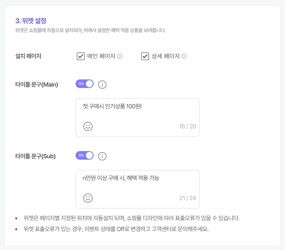 타이틀 문구(Main, Sub): 위젯 내에서 보여질 문구를 수정 할 수 있어요 (기본 템플릿 제공)