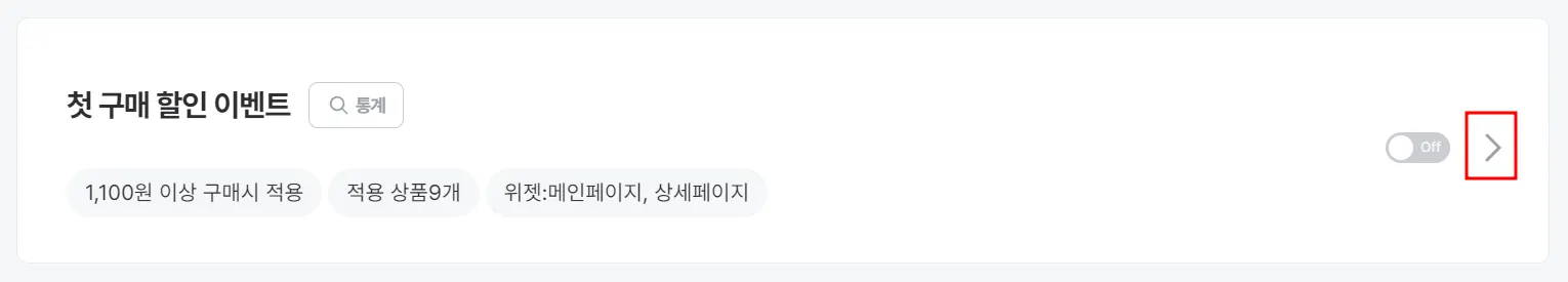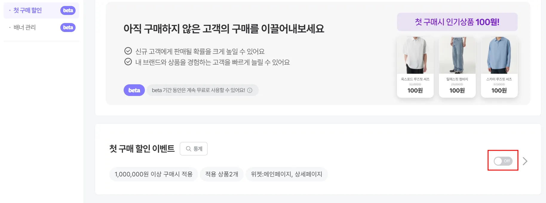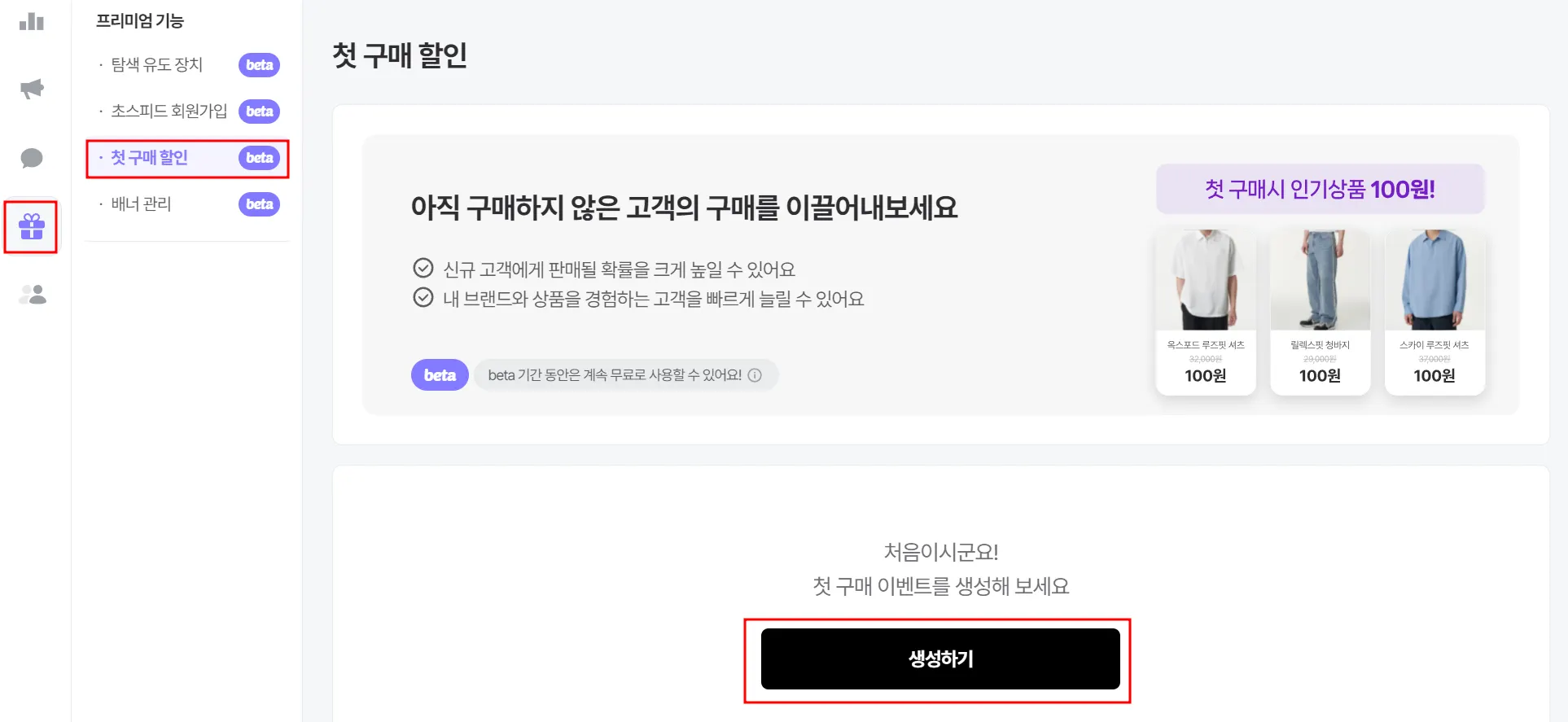 대시보드의 [프리미엄 기능 > 첫 구매 할인] 메뉴로 이동 후 설정을 시작해주세요