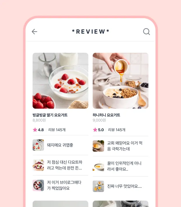 상품별 리뷰 목록 게시판과 PC에서 리뷰가 보여지는 위치만 다른 디자인으로 제공되고 있습니다