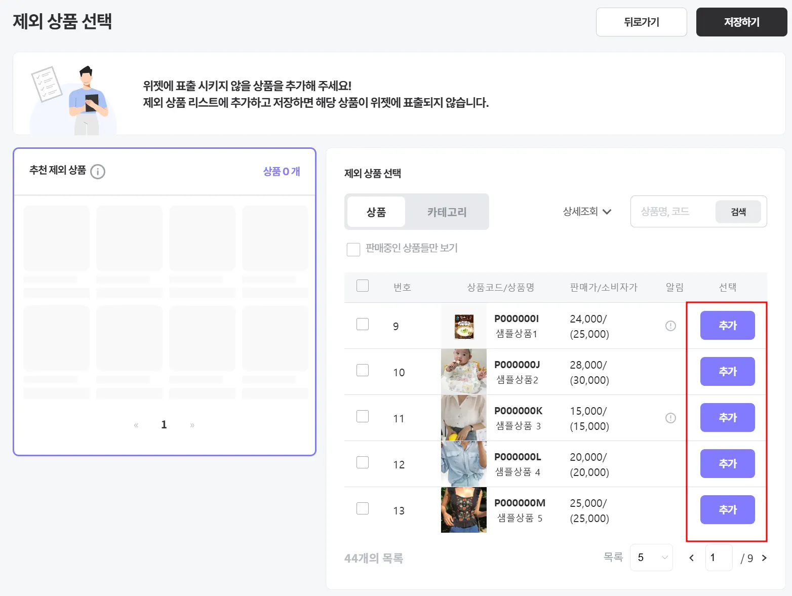 접속 경로: [상품 추천 > 위젯에 상품 표출 제외 > 상품 등록]