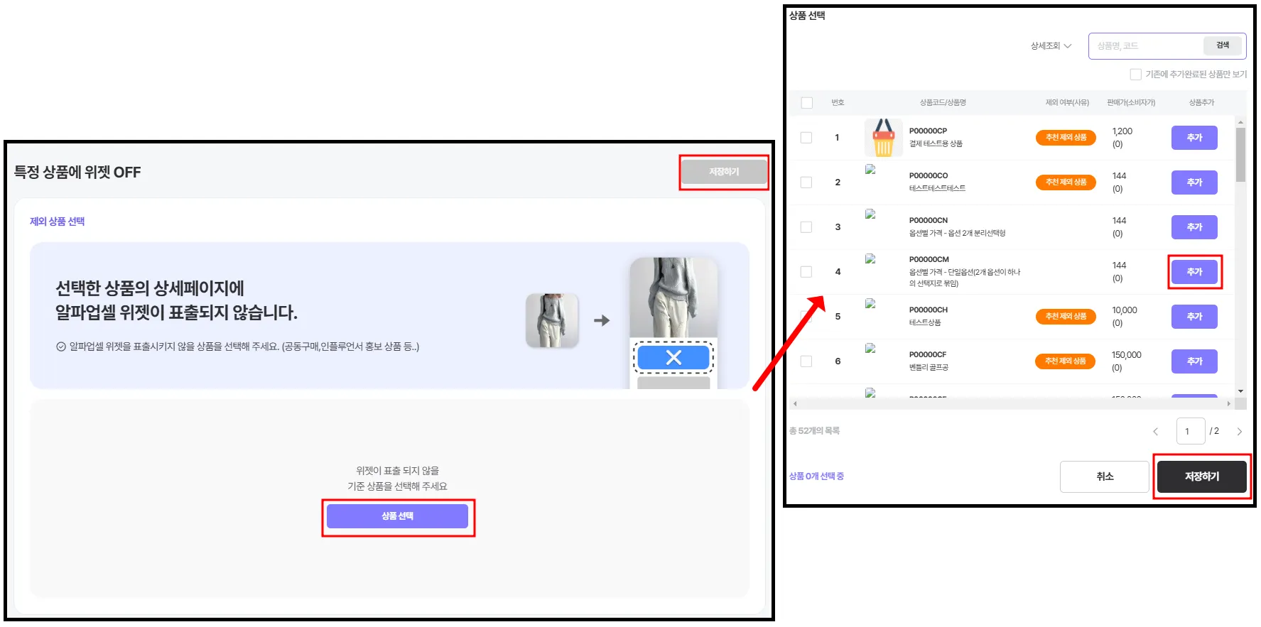 위젯이 노출 되지 않을 상품을 선택해주세요