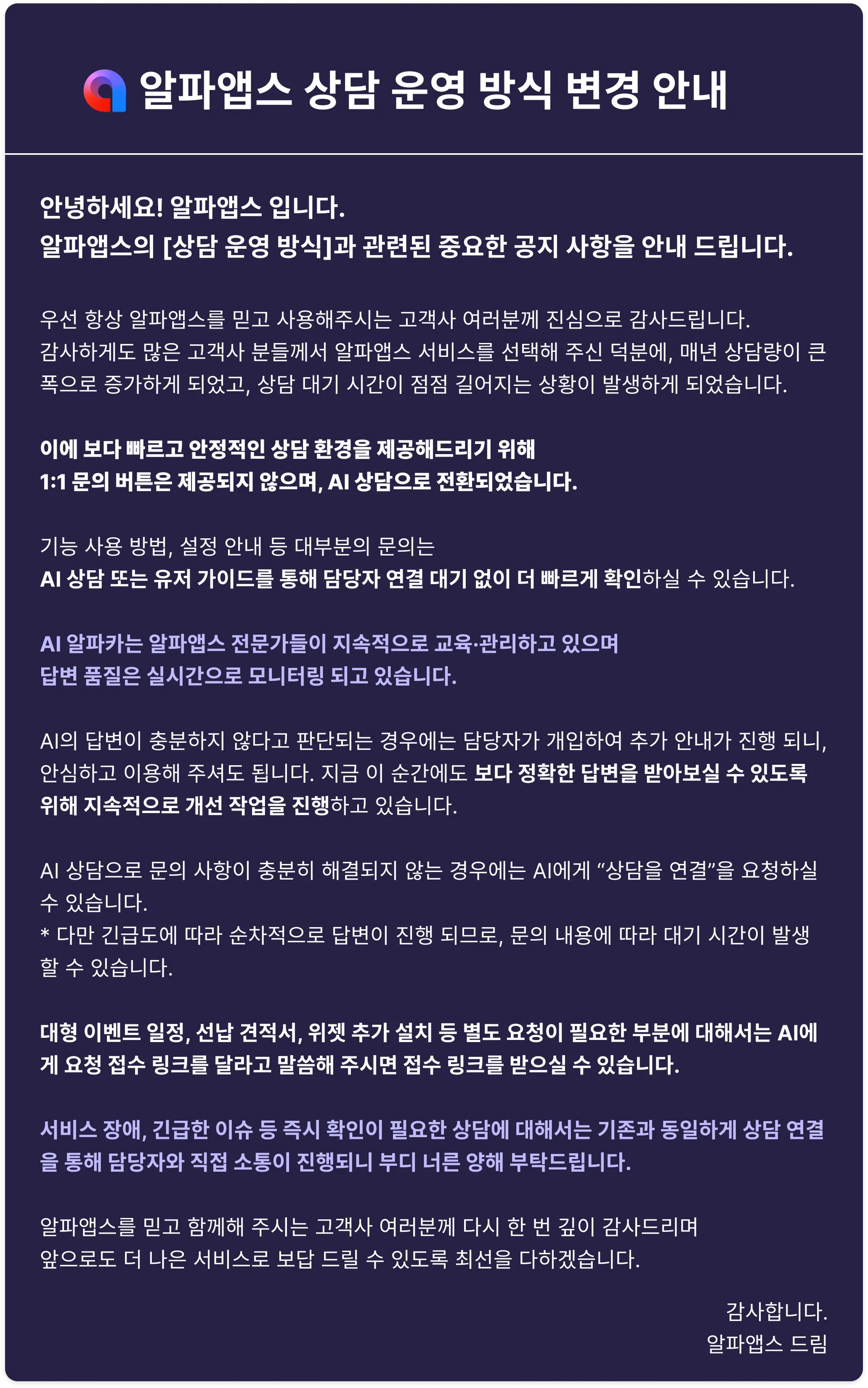알파앱스 상담 운영 방식 변경 안내(26.02.01)