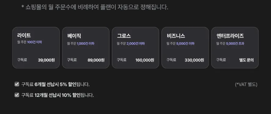 구독료가 결정되는 월 주문 건수는 카페24에서 발생한 주문 건의 수로 적용 됩니다.