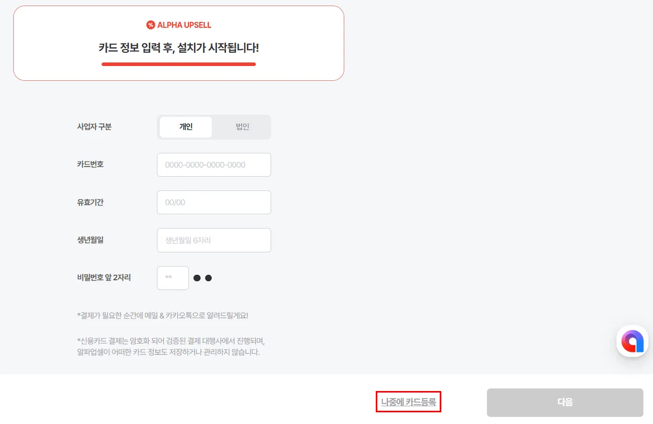 알파업셀 설치 접수 시 카드 등록을 해두시면 14일의 무료 체험 기간 종료 후