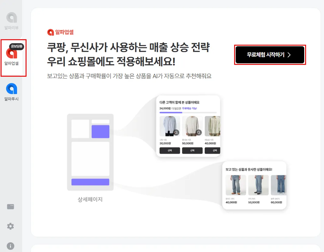 알파업셀 설치 후 알파 업셀 무료체험 시작하기를 클릭해주세요!