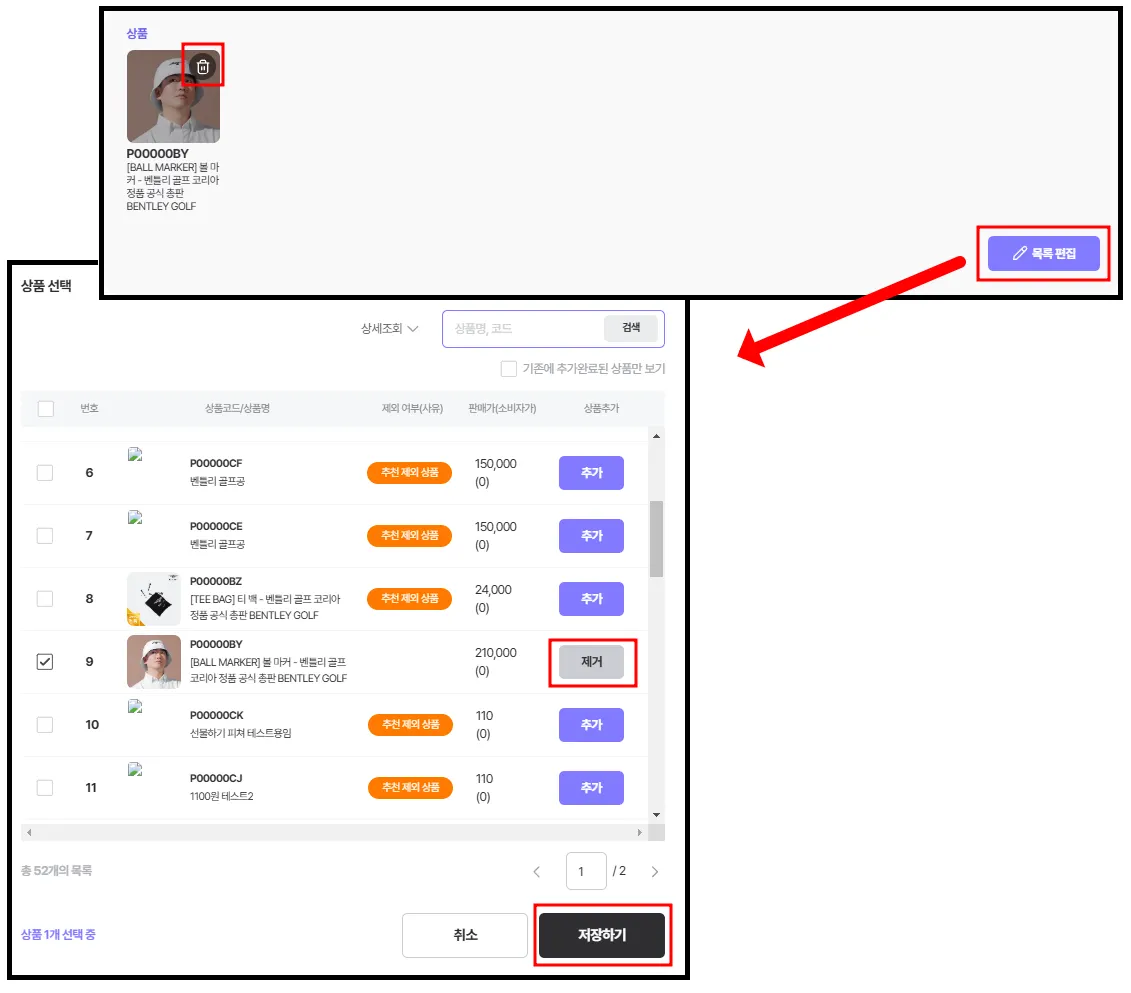상품 이미지에 마우스 오버 후 노출 되는 삭제 이모티콘을 눌러 삭제 하거나 목록 편집에서 상품 제거를 통해 수정 할 수 있어요