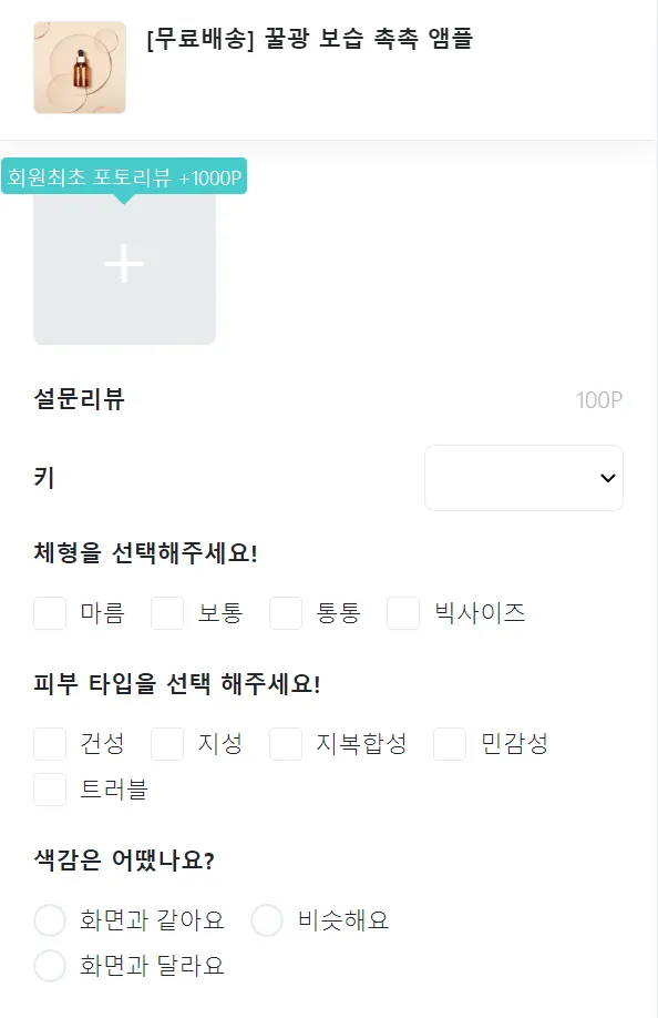 고객에게 원하는 답변 또는 프로필 등의 데이터를 리뷰로 작성하도록 "설문리뷰" 기능을 제공해드리고 있습니다