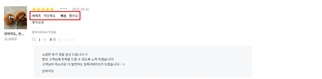 리뷰란 앞서 상품을 구매했던 고객들이 구매를 망설이는 고객들에게 상품에 관련한 유용한 정보를 전달하는 역할을 합니다