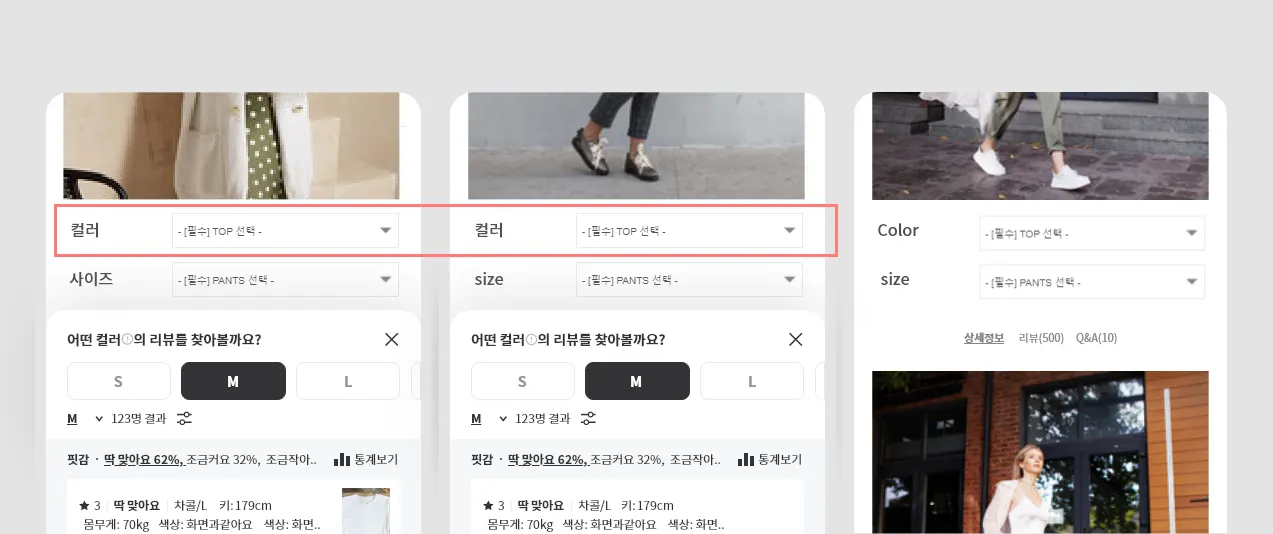 상품마다 적절한 '필터 기준'을 적용해주면 고객이 리뷰를 빠르게 원하는 리뷰를 확인할 수 있습니다.