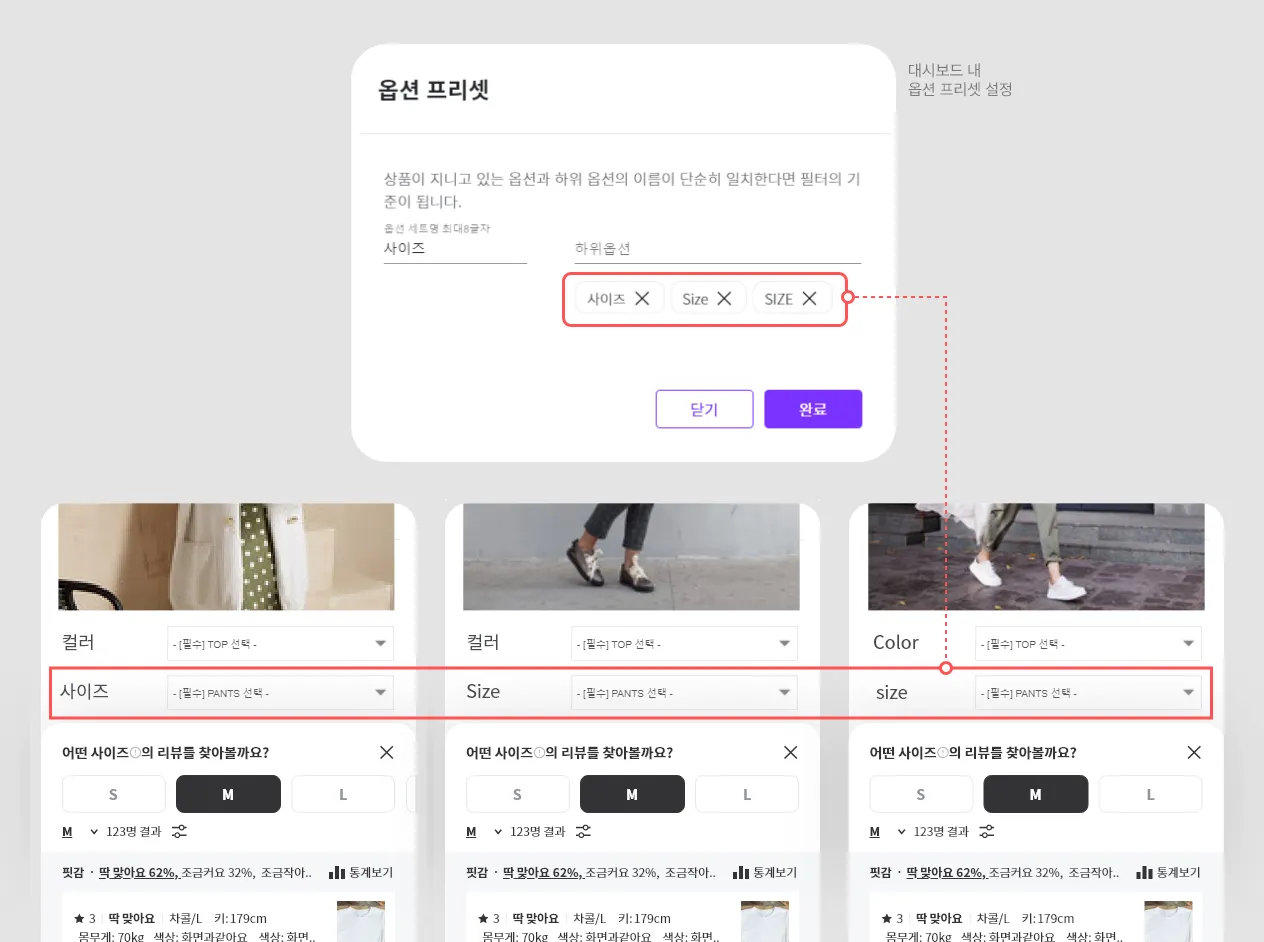 2) 컬러와 'color', 사이즈와 'Size'를 같은 기준으로 설정하려면?