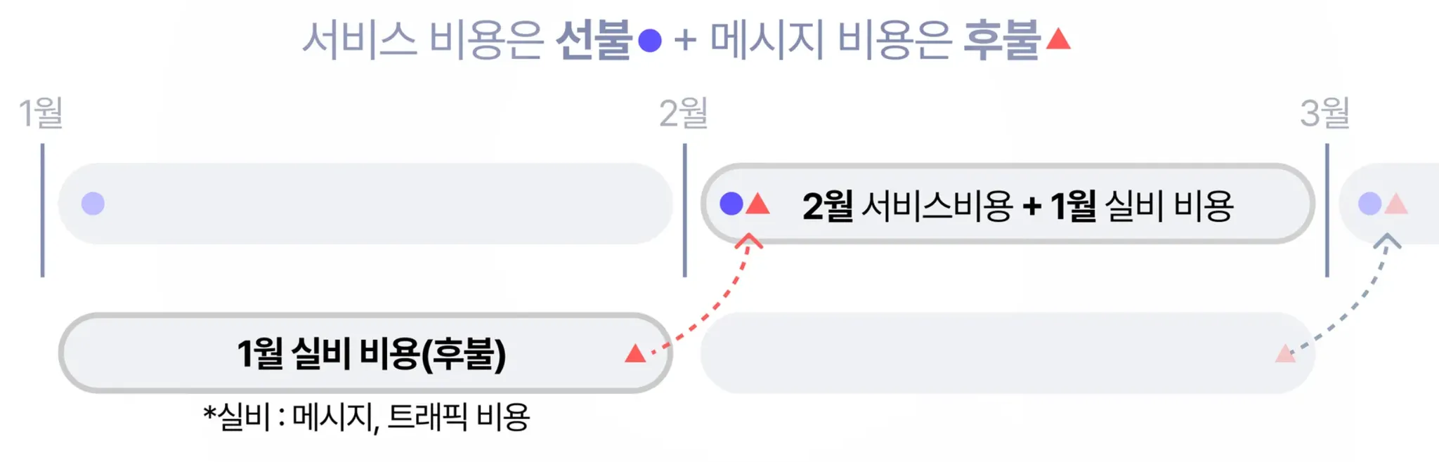 다만, 알림톡/트래픽 비용은 후불로 유지 되므로 매월 1일 사용료가 선불로 결제되고, 이번달 크래딧(알림톡/트래픽) 비용은 다음달에 후불로 결제 되는 방식이에요!