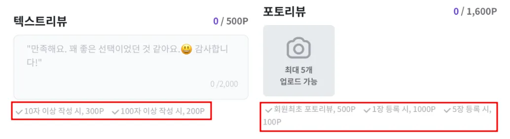많은 이미지, 장문 텍스트 등 의 추가 포인트 설정을 해두신 경우 리뷰 작성페이지 내에 보여져요