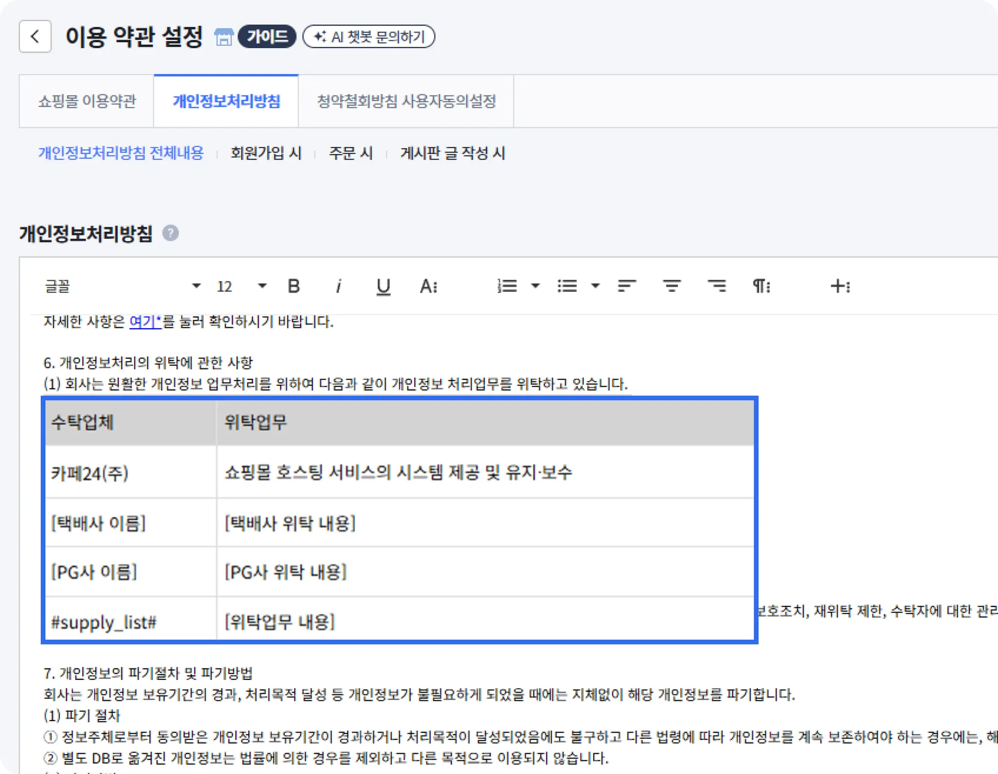 2. 개인정보처리방침을 아래와 같이 수정해 주세요.