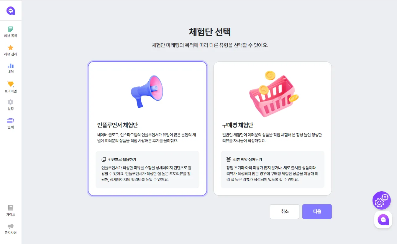 체험단 캠페인은 인플루언서 체험단, 구매평 체험단 중 원하는 유형을 선택해 진행하실 수 있어요.