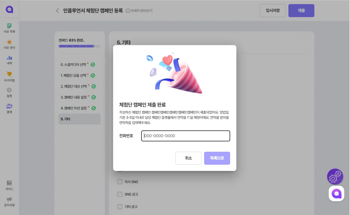 캠페인을 제출하면 3-5일 이내로 체험단 플랫폼 측에서 남겨주신 연락처로 연락을 드릴거에요.