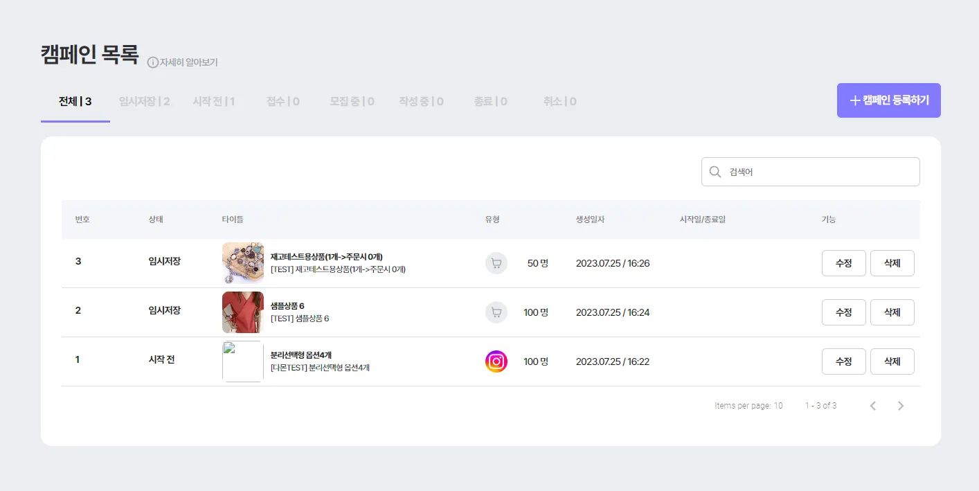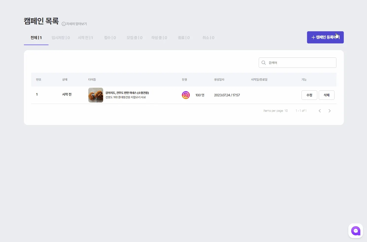 캠페인 목록을 통해 등록한 캠페인의 상태를 확인하거나, 수정/삭제할 수 있어요.