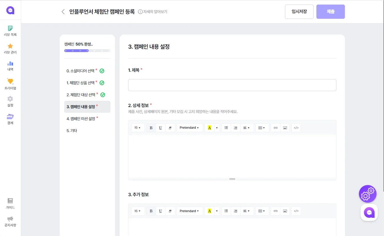 체험단 모집 시 모집 페이지에 노출될 내용을 설정할 수 있어요.