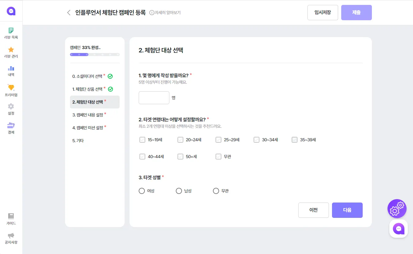 체험단은 5명 이상부터 진행이 가능하고, 연령대 및 성별은 쇼핑몰의 타겟층에 맞춰 진행하는 것이 좋아요.