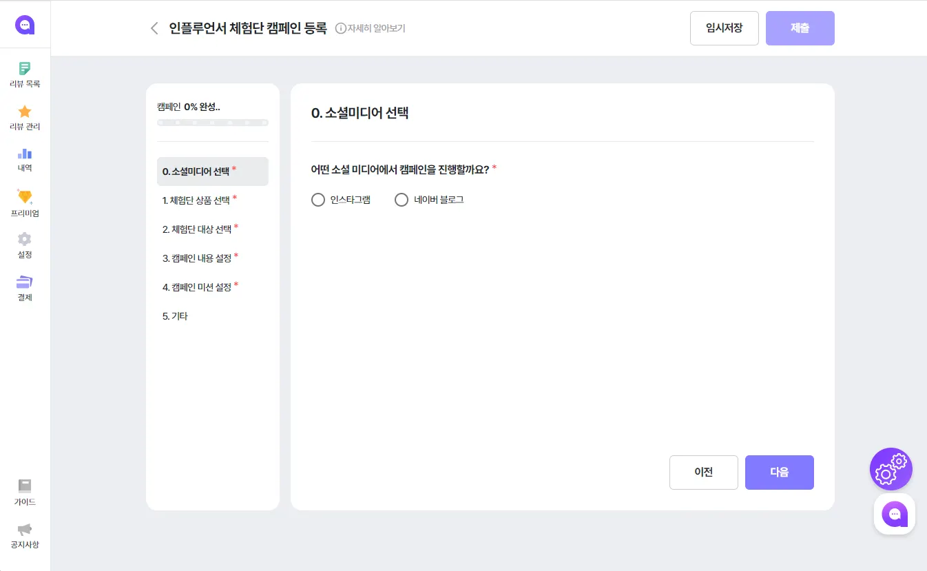 인플루언서 체험단 유형을 선택하신 경우, 어떤 소셜 미디어에서 캠페인을 진행할지 선택해주세요. 현재 인스타그램 및 네이버 블로그를 통한 인플루언서 체험단 캠페인을 생성할 수 있어요.