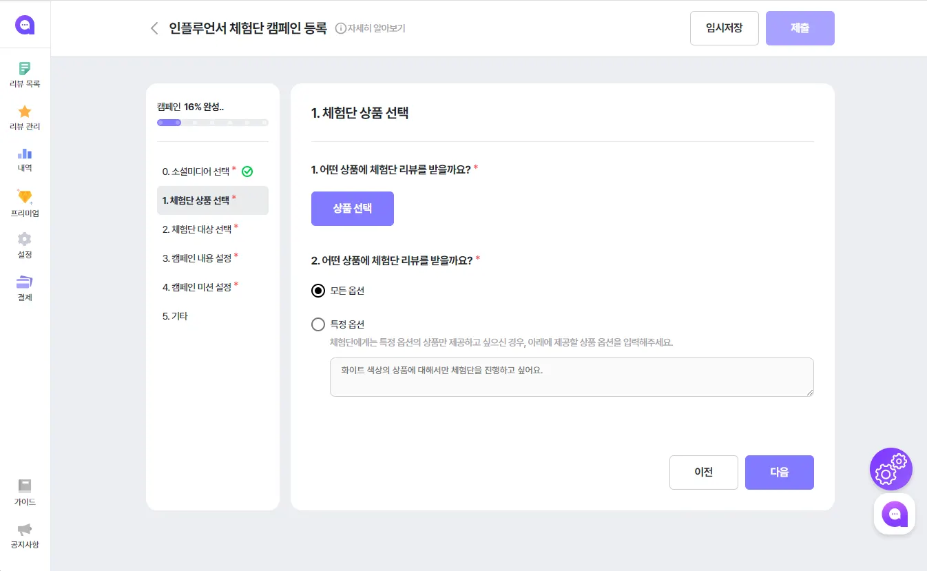 특정 옵션에 대해서만 체험단 리뷰를 받고 싶으시다면, 특정 옵션을 선택한 후 진행 원하는 옵션을 입력해주세요.