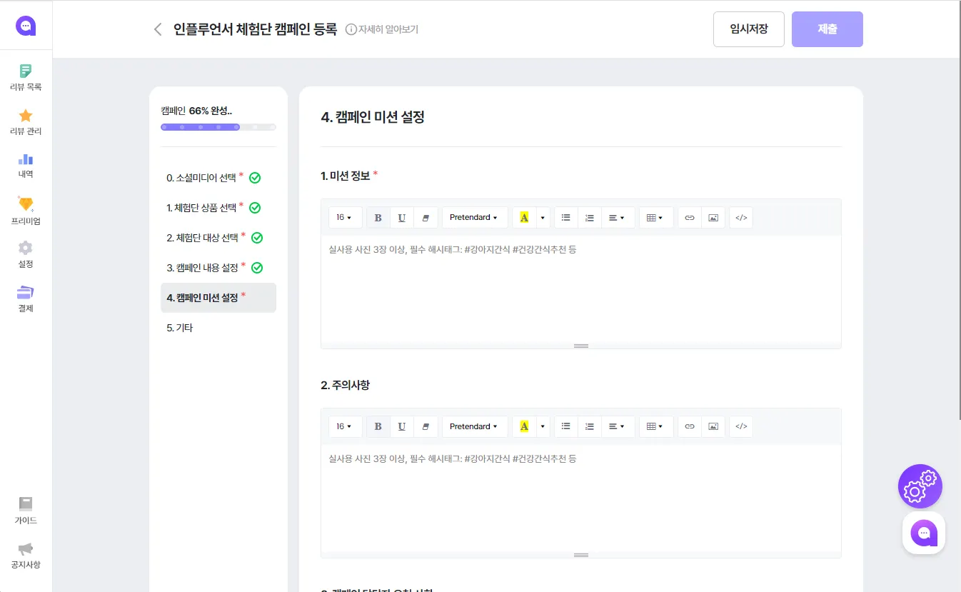체험단 모집 시 체험단에게 고지할 미션의 내용을 설정할 수 있어요.