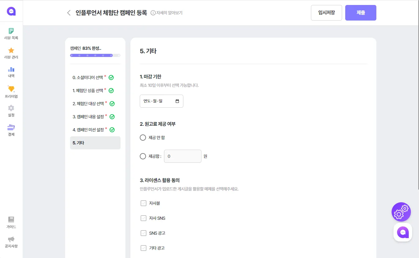 원고료 제공 여부: 특히 인플루언서 체험단을 모집하는 경우, 원고료 제공 시 더욱 퀄리티 좋은 리뷰를 받아보실 수 있어요.