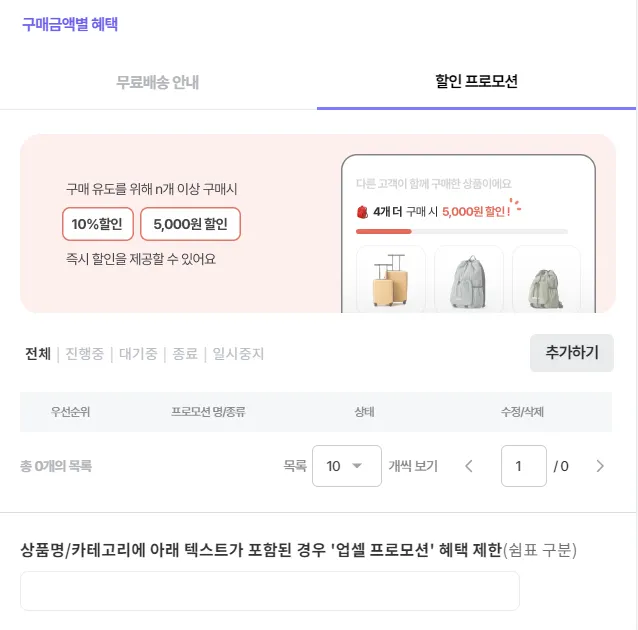 프로모션이란 고객이 상품을 구매했을때 자동으로 할인이 적용되는, 특정 금액 이상 구매시 할인 이벤트를 진행실때 활용하실 수 있는 기능이에요!