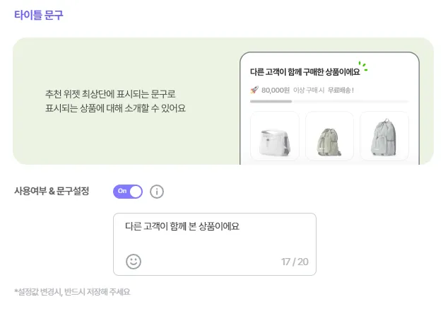 상단의 타이틀 문구, 추가 구매시 혜택 등을 커스텀하여 사용하실 수 있어요