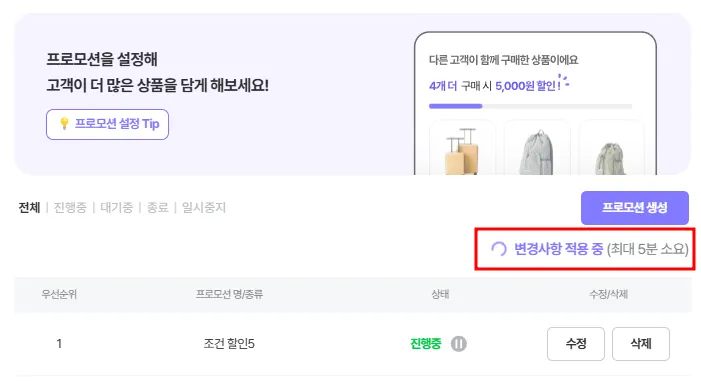 진행 중인 상시 적용 프로모션을 종료하고 싶으시다면 수정/삭제에서 삭제 버튼을 눌러주세요!