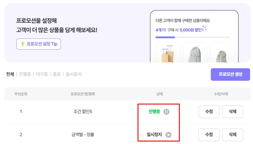 생성한 프로모션은 목록에 남아있고, 추후 원하는 시점에 다시 프로모션을 재개 할 수 있어요