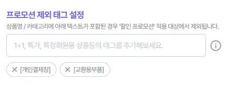 상품명/카테고리에서 설정한 텍스트가 포함 된 경우 ‘할인 프로모션’대상에서 제외되도록 수동으로 입력할 수 있어요